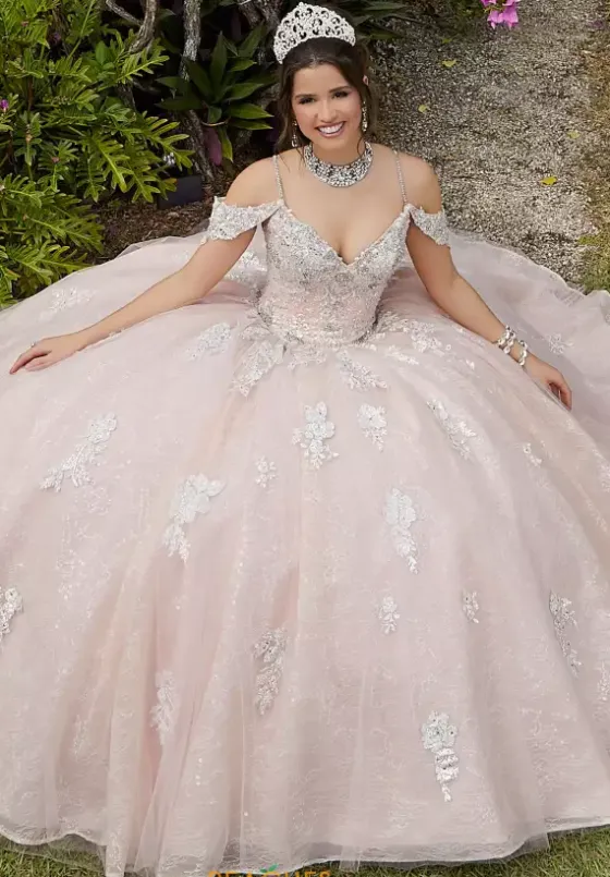 Captivating Vizcaya ball gown dress 89281 showcases an off the shoulder v neckline with crystal beaded straps and delicate cap sleeves. The embroidered fitted bodice leads into a dropped basque waistline. This style will sparkle beautifully as this dress is made with glitter embroidery over sequined lace. Classic corset lace up back and embellished train completes this look. Matching stole included.