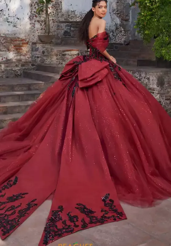Put a smile on the audiences face as you walk into your next event wearing this long ball gown by Vizcaya style, 89535. Beautiful beaded applique corset accompanied with detachable off the shoulder sleeves having you feel your best. The voluminous skirt with dazzling glitter tulle starts at the waistline with an eye catching bow behind, flowing down into a long train.