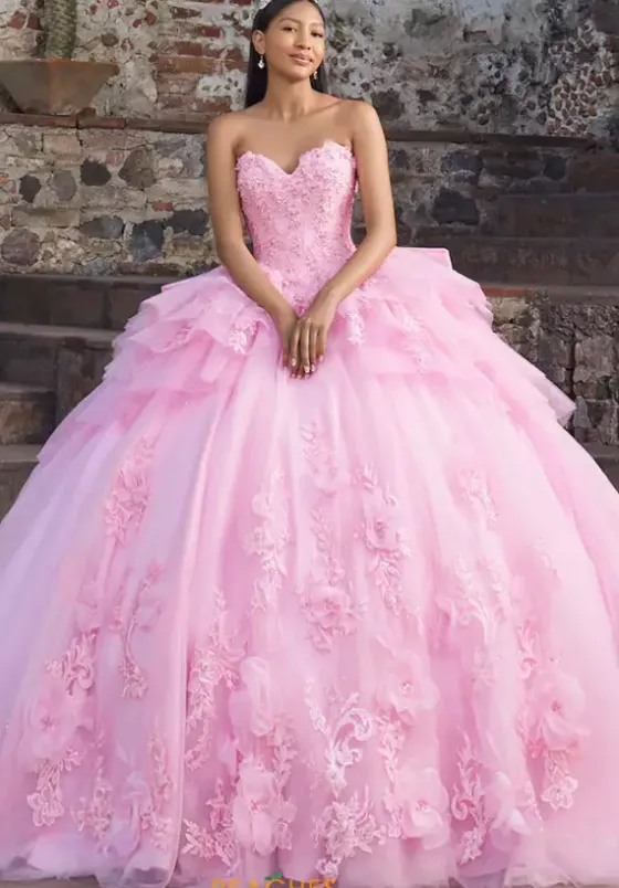 Step into a fairy tale in this breathtakingly dreamlike Vizcaya Quinceanera dress, style 89558. This mesmerizing ball gown features a strapless sweetheart neckline paired with detachable long sleeves adorned in delicate applique for a regal touch. Made from luxurious layers of glitter tulle and organza, the ball gown highlights bold applique accents across the corset, enhanced by intricate beadwork. And for a truly unforgettable finish, an oversized statement bow graces the back, making every exit as stunning as your entrance.