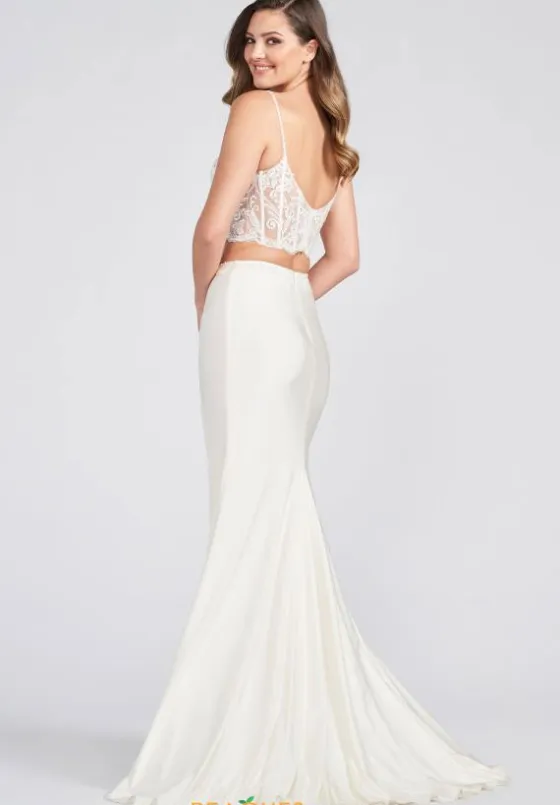 Show off your amazing fashion sense and wear this sexy and chic two piece style EW122043 by Ellie Wilde. The corset style bodice has a mesh illusion base adorned with sparkling lace appliques. The jersey fit skirt showcases beautiful bead work that flows from the waist down the slit. Additional features include a v neckline and train.