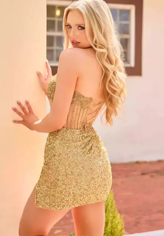 Sophisticated short style 4445 by Primavera is one for the books. The remarkable illusion bodice is embellished with complex beading heavily along the neckline and cascades down the bodice into individual lines. Showcasing the fitted skirt adorned with dazzling sequin and a tasteful skirt to complete this beautiful ensemble.