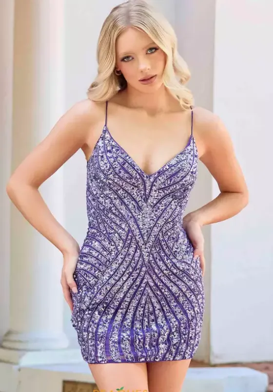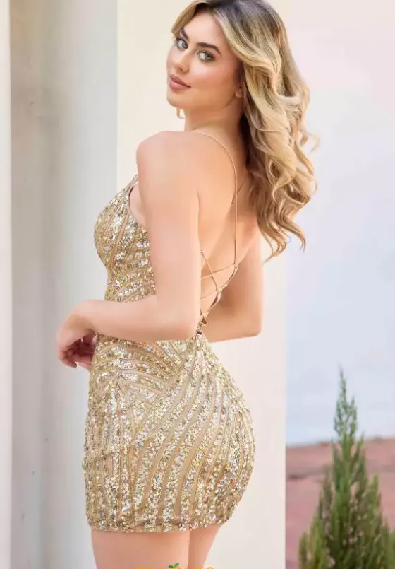 Flash effortlessly in perfect chic short style 4483 by Primavera. The v neckline is paired with a waist accentuating corset lace tie back with an appealing open back. Detailed with captivating unique beading and sequin combination to add natural dimension to the figure effortlessly in all your photos.