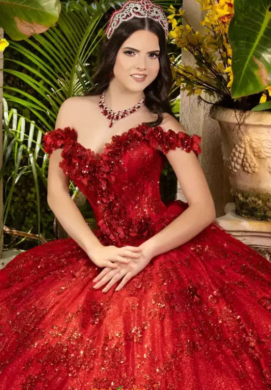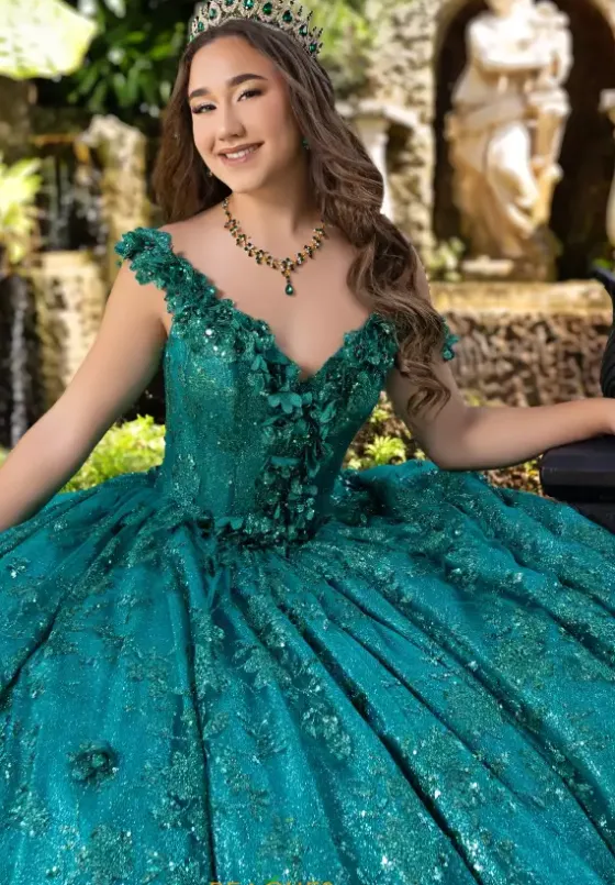 Feel like a modern day princess in this extravagant ballgown by LIzLuo, style 80006. Showcasing an off the shoulder v neckline. This number is fully adorned with glistening beadwork and gorgeous applique. The glittered tulle is going to have you sparkle bright all night long. Along the neckline and cap sleeves it has gorgeous flowers.