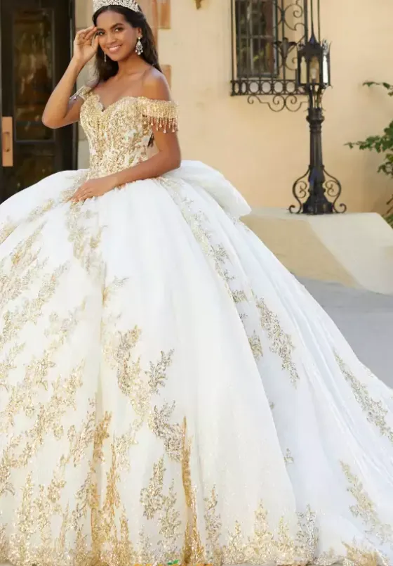 Look like royalty in glistening ball gown 26060 by Tiffany Quinceanera. Contrasting sequin and fringe beadwork details are featured throughout the entire dress giving you eye catching detail and sparkle as you flaunt the classic sweep train and traditional corset bodice along with the voluminous glittering tulle skirt. This dress is completed with an oversized bow.