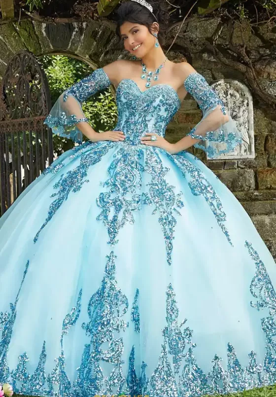 This captivating ball gown dress 89255 is fashion perfection. Charming and charismatic, this beautiful gown showcases a strapless sweetheart neckline with beaded detachable bell sleeves. Opulent rose gold embroidery adorns the gown highlighting an elaborate detailing. Flattering on all, the lace up closure defines your figure, while the glamorous sweep train makes for an impeccable finish.