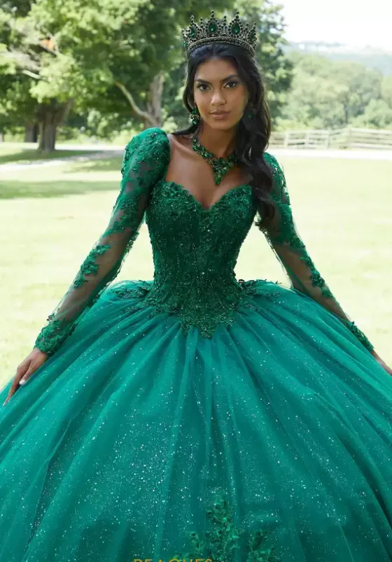 Feel like royalty in this gorgeous Vizcaya quince ball gown style 89443. The long waisted corset style bodice features detachable long sheer sleeves with pouf details at the shoulders. The full ball gown skirt is made from sparkling glitter tulle and on the back of the train at the top is a detachable bow. A matching stole included.