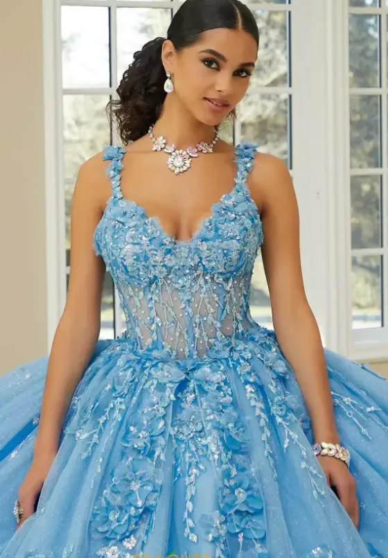 Dance the night away in this jaw dropping Vizcaya long dress 89475 for your special day. This full ball gown showcases a flattering v neckline with floral straps matching the sheer glitter corset bodice. The glitter tulle skirt is adorned with unique lace applique and a detachable must have bow that will have all eyes on you. A matching bolero jacket is included with this ball gown.