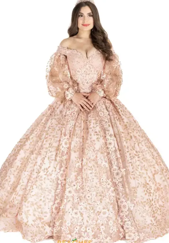 Shine bright like a diamond in captivating ball gown 89411 by Vizcaya. Featuring detachable bishop sleeves to match, this dress is a must have. The corset bodice showcases ornate beading while stunning appliques make a transition onto the voluminous shimmering tulle skirt. This dress features the traditional lace up closure and sweep train.