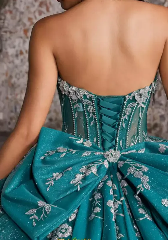 Be the spotlight of the night in this truly captivating ballgown by Vizcaya Quinceanera, style 89563. Featuring a endearing sweetheart neckline with off-the-shoulder straps exuding elegance. Bold beading paired with intricate applique adorns the corset and flows seamlessly into the long glitter tulle train. Completing the look, a dramatic bow cascades to match the length of the train. For an unforgettable entrance, a detachable high collar with scalloped detailing adds a regal touch that’s sure to leave everyone in awe as they see you.