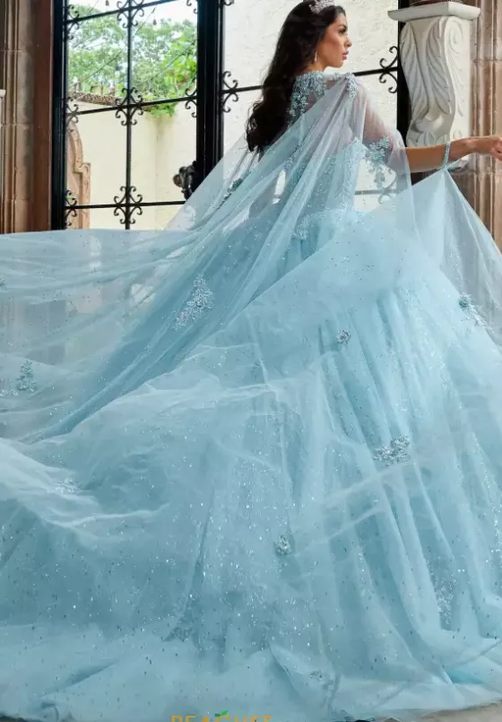 Bring the glamorous drama to your quince dress with this cape from Rachel Allan Quince style QS1162. This long flowing glitter tulle cape attaches with a collar at the front of your neck while the tulle falls. The shoulders and neckline are adorn with gorgeous appliques. This is the cape only and the dress is sold separately from Rachel Allan Quince style RQ112.