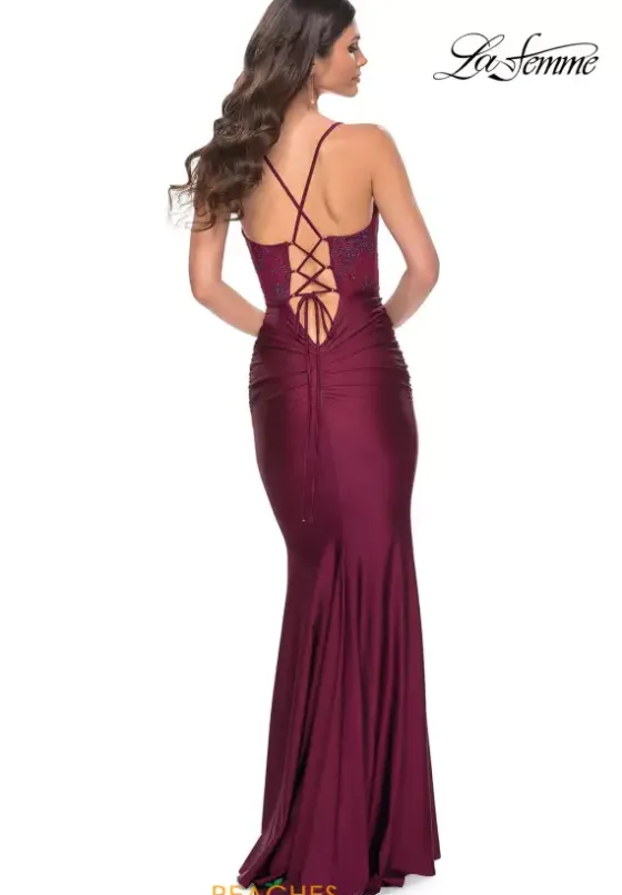 Fun and fabulous, this gorgeous La Femme dress 31857 is an ideal choice for your next social occasion. This breathtaking ensemble features a scoop neckline and dainty thin straps. The lace bodice accentuates your curves, while the lace up closure defines your hourglass silhouette. Made in a fitted jersey fabric, the long fitted skirt showcases an elegant sweep train.