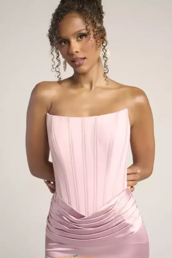 Sleek sophistication exudes when you wear this classic Portia and Scarlett long dress style PS26032 to your next social occasion. Made in rich satin colors, this phenomenal gown features a strapless corset bodice with a scoop neckline, visible boning and V back with zipper closure. The long slim skirt has pleating at the waist and backside ruching.