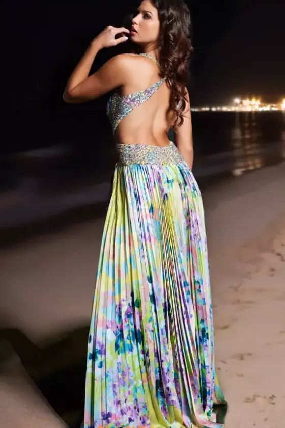 Be bold and get noticed at prom in this eye catching floral print Jovani long dress style 38733. This impeccable gown features a fitted bodice with a pleated bust, beaded midriff with side cut outs and beaded straps that crisscross over the open back. The lovely long, a line skirt is pleated and flowing with front, side slit and sweep train.
