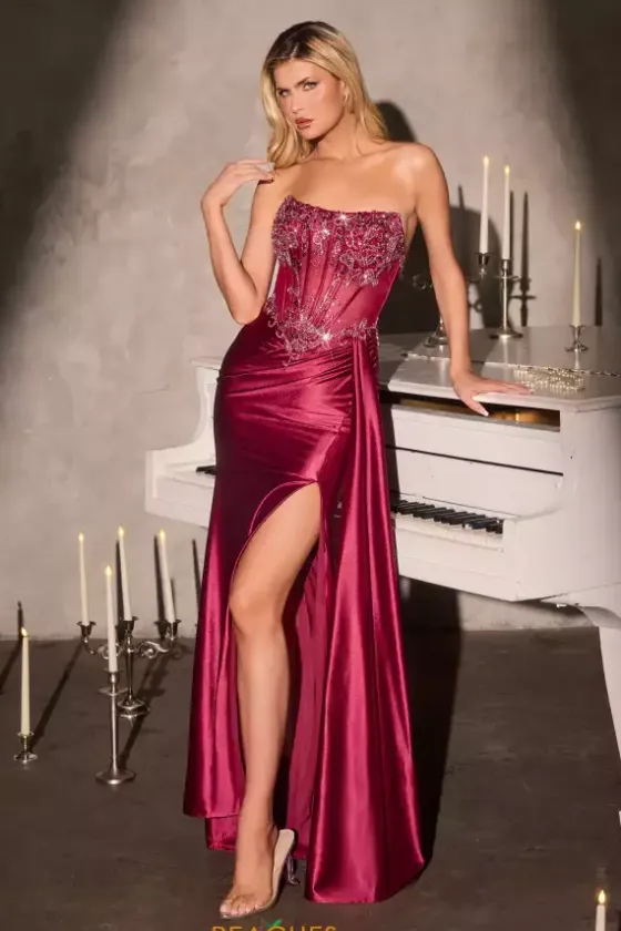 Strut with confidence when you wear this figure flattering La Divine by Cinderella beaded floor length prom dress style 106C169. This on trend style consists of a strapless zipper corset bodice adorned in glistening beads and appliques that gleam against the luminous ruched stretch satin thigh high slit skirt.