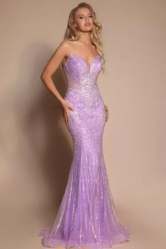 Exude elegance wearing this scintillating Portia and Scarlett PS26004 embellished with slimming lines of radiant beading sculpting your figure beautifully. The sensational silhouette showcases a strapless fitted bodice with a V neckline and low zipper closure back. The long straight skirt flows to floor with a horsehair hem edge.