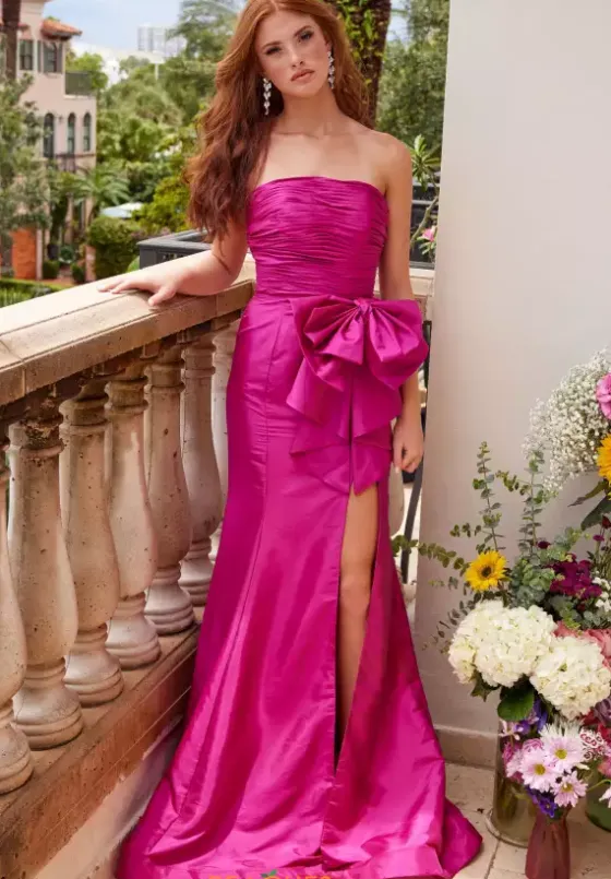 Stop the show when making your entrance in eye catching long style 40072 by Ava Presley. Featuring the strapless straight across neckline paired with a fitted bodice detailed entirely of pleating for an instant snatch to the waistline and displaying a unique bow to sit just above the slit. Showcasing the trumpet like taffeta skirt followed with a train.