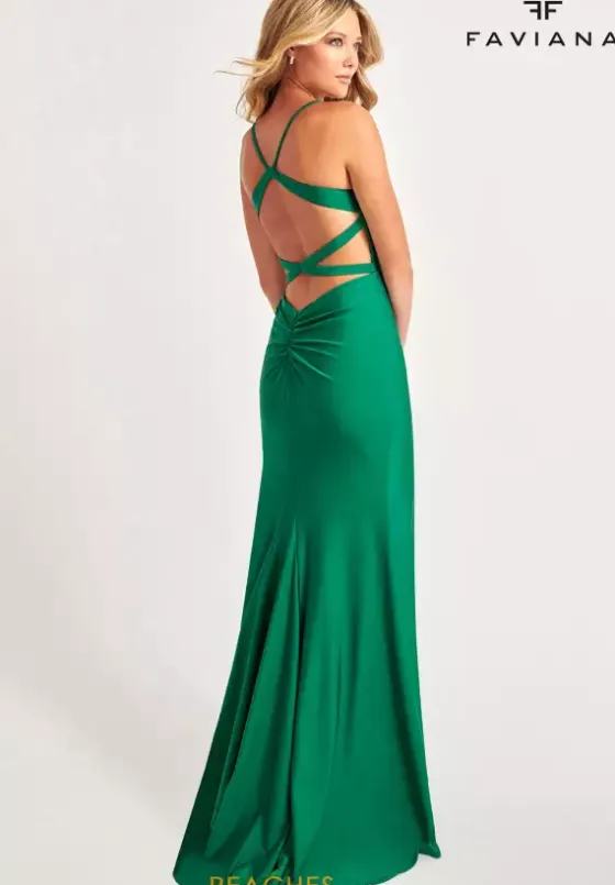 Choose simple sophistication for your next social occasion and wear this chic Faviana long dress style 11045. Offered in vibrant shades of charmeuse fabric, this gorgeous silhouette showcases a fitted bodice with a scoop neckline, thin straps and a cut out strappy low back. The long form fitting skirt has a front, side slit and sweep train.