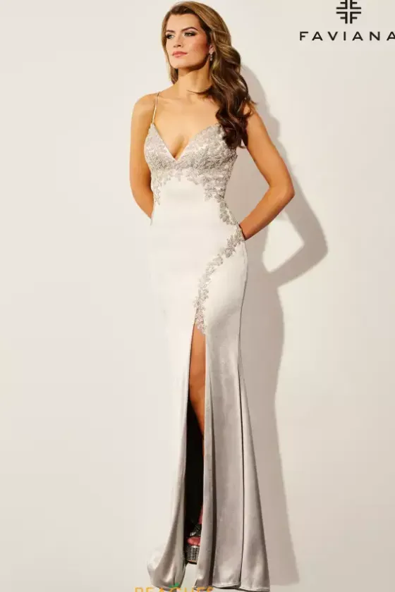 Be the talk of the night when you wear this long fitted dress by Faviana style 11401. This dress features a V neckline that cascades into a open corset back that laces up and is also open. The dress is made from stretch satin material and beading along the top and the slit as well as a train that will follow behind you.