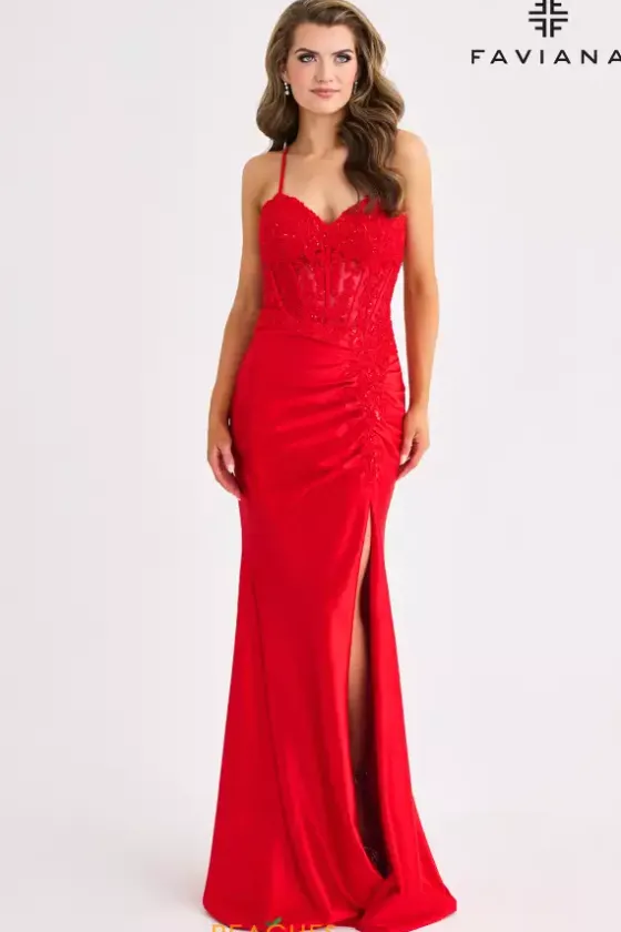 Faviana dress 11414 is the perfect choice for any special occasion. This lovely fitted silhouette showcases a modest v neckline paired with simple shoulder straps. A touch of unique lace applique is adorn on the fitted bodice cascading into the shiny satin material showing off your thigh high slit and intricate open back.