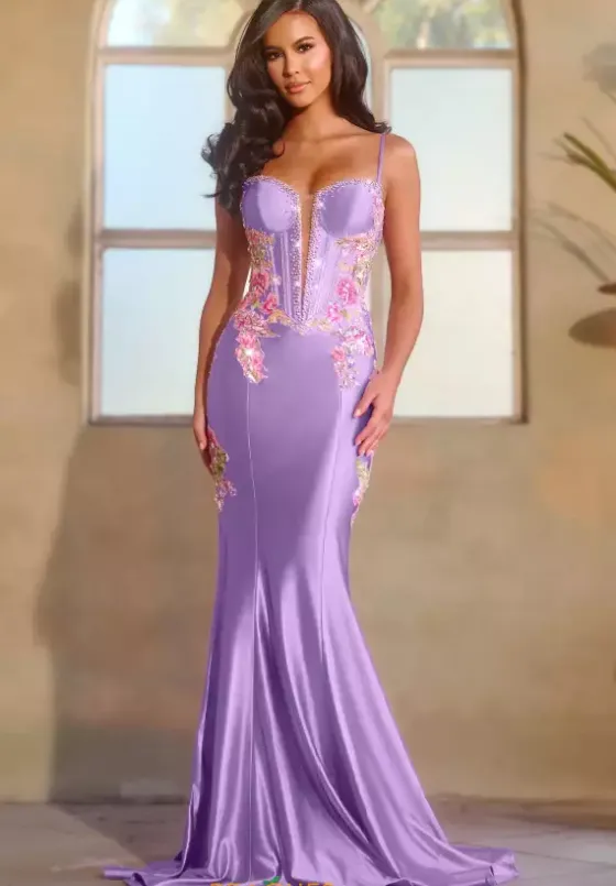 Radiate your dazzling energy in this show stopping long fitted gown by Starielle style number STR64. This captivating dress features a classic V shaped neckline with thin straps for support and a structured corset bodice with exposed boning that will accentuate your figure flawlessly. The bodice and sides are embellished with gorgeous floral applique and sparkling beadwork.